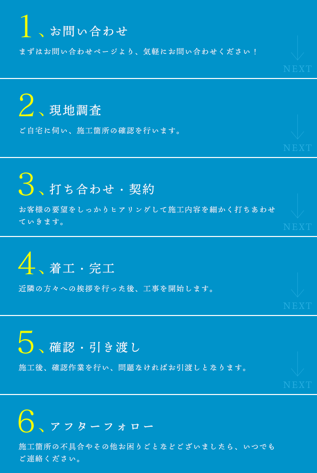 これまで数多くの施工を担当してきたベテランの職人が施工前の現地調査・打ち合わせから担当いたしますので、お客様のこだわりもそのまま反映させることが可能です。